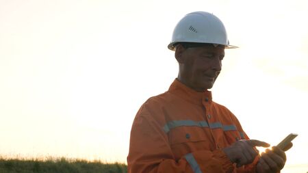 portrait of young engineer in vest with white helmet standing on construction site, smiling and holding smartphone for worker, internet, social media