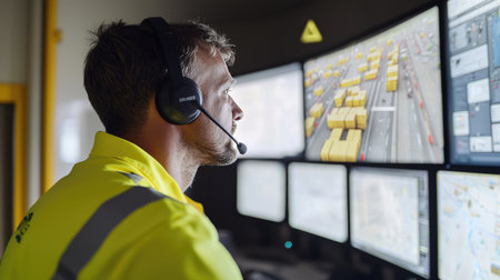 Onduty officer in headset keeping watch in the city for quick response. Concept Law Enforcement, City Surveillance, Security Officer, Communication Technology, Emergency Response