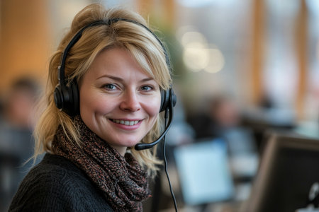 Smiling blonde woman in headset at call center office with blurred background in stock photo style