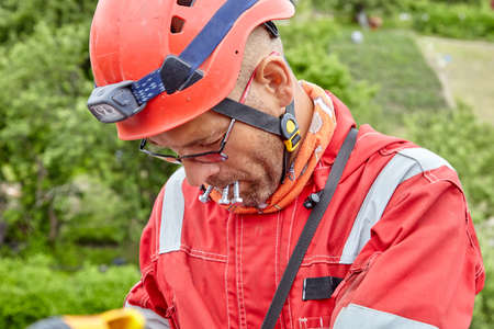 Industrial climber in helmet and overall working on height. Risky job. Professional worker