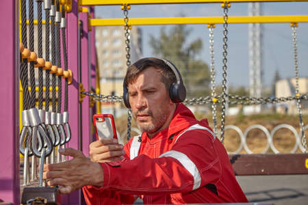 A man in a red work suit repairs a playground. A worker repairs a playground.