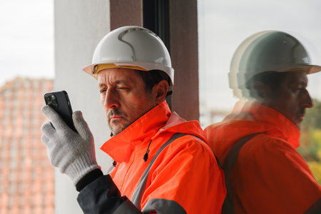 Civil engineer wearing safety jacket and hardhat using smartphone at construction site, concept of communication, planning, and modern technology in engineering. Selective focus.