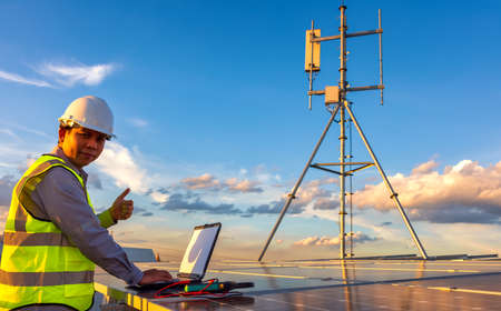 Engineer using laptop at solar panels on rooftop at sunset sky, An engineer working at a photovoltaic farm. Eco technology for electric power