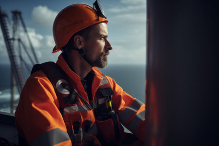 Marine Deck Officer or Chief mate on deck of ship with VHF radio