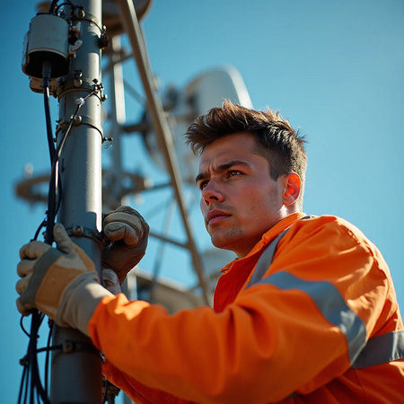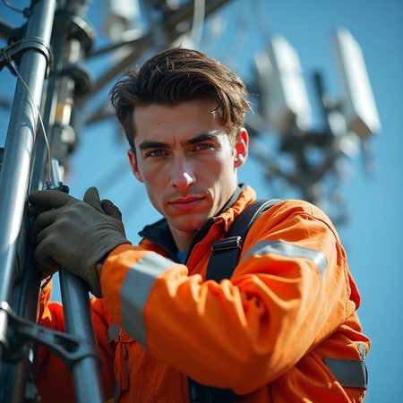 technician working on a 5G cell tower, highlighting the infrastructure behind fast and reliable wireless communication.