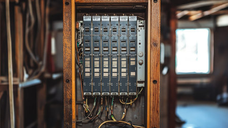 Home circuit breaker box opened during inspection or repair, showing labeled switches