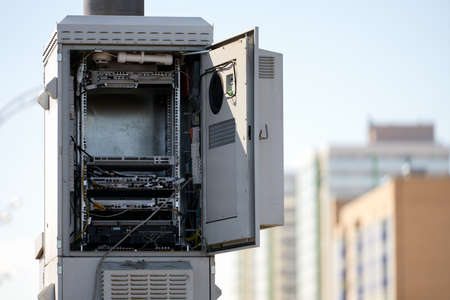 The case of the cellular base station unit with an open door on the background of high-rise buildings. Selective focus. Copy space.