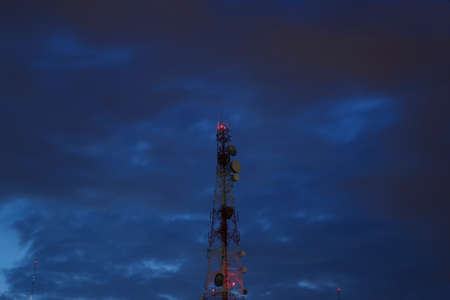Telecommunication tower Antenna and satellite dish at sunset sky background.