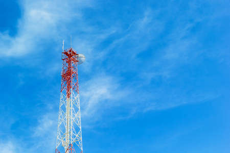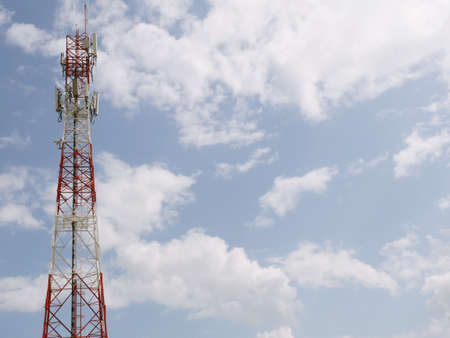 Telecommunication tower with blue sky and white clouds. Antenna on blue sky. Radio and satellite pole. Communication technology. Telecommunication industry. Mobile or telecom 4g network. Technology