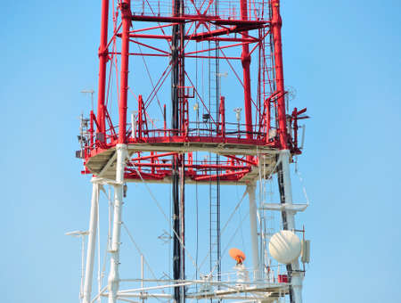 Telecommunication tower with clear blue sky background. Antenna on blue sky background. Radio and satellite pole. Communication technology.