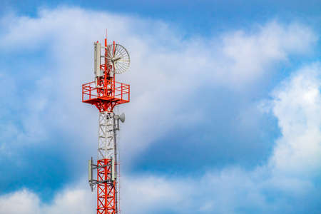 Telecommunication tower with blue sky and white clouds. Radio and satellite pole. Communication technology. Telecommunication industry. Mobile or telecom 4g and 5g network. Telecommunication pylon.