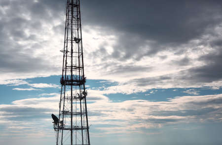 Radio mast (tower) with antennas for telecommunications and broadcasting and cloudy sky. Close-up