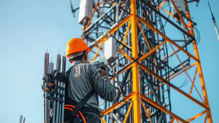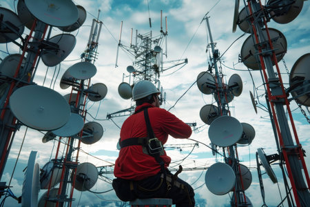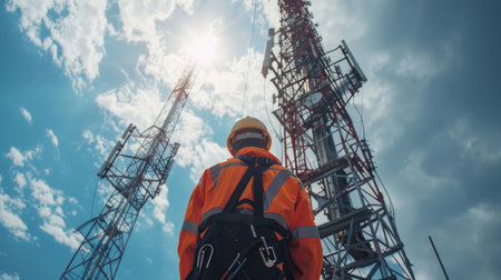 Telecommunication engineer wearing safety equipment and working at great heights on a telecommunication tower