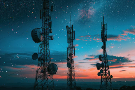 Telecommunication towers standing tall against a colorful starry sky at sunset, highlighting the advancement of technology and communication