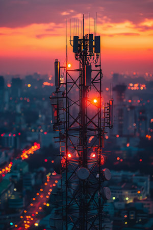 A tall telecommunications tower with multiple antennas and dishes silhouetted against a vibrant sunset sky, showcasing modern communication infrastructure and wireless connectivity.