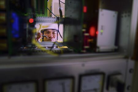 Engineer in yellow uniform, wearing a white safety helmet, checking communication system, big data concept.