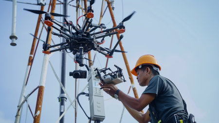 A technician using a drone to inspect a cellphone tower, showcasing modern methods of maintenance and monitoring.
