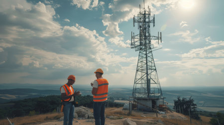 A team of engineers at the base of a cellphone tower, discussing plans and performing technical assessments