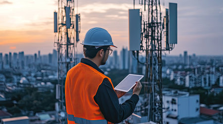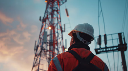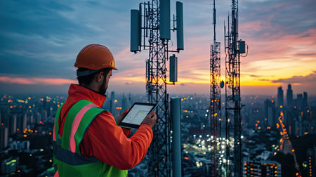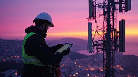 A technician in safety gear checks data on a tablet while silhouetted against a stunning sunset skyline, showcasing telecommunications and infrastructure work.