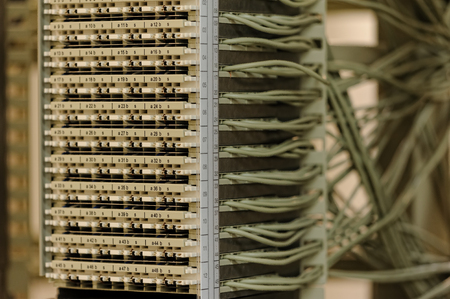 Old analog telephone switchboard system connection panel with wire fixed-line in old cabinet with copy space.
