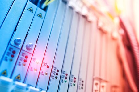 Close up view of internet equipment and cables in the server room. Broadcast system room.