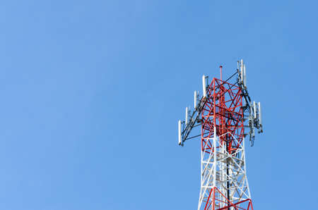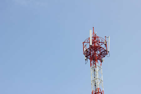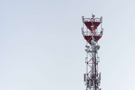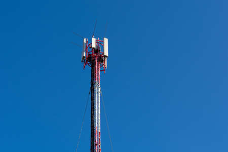 Telecommunication red tower with antennas and blue sky in the background. Mobile phone communication equipment. Copy space for text or design
