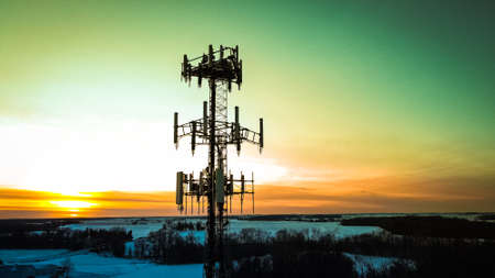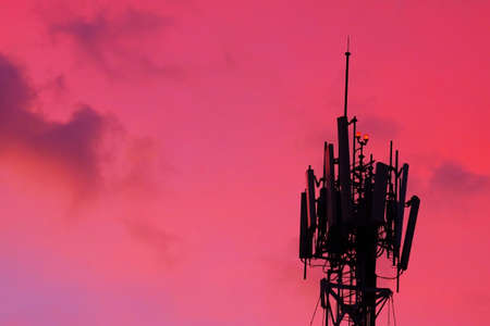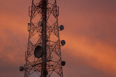 Telecommunication tower of 3G, 4G and 5G network during sunset. Technological concept in communication. Pylon, antenna, microwave and nature background..