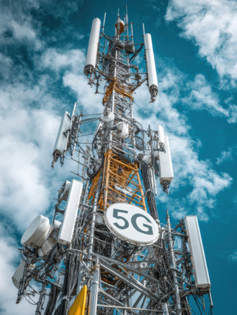 A 5G mobile internet communication tower transmits wireless signals under a bright sky, showcasing modern telecommunication technology.