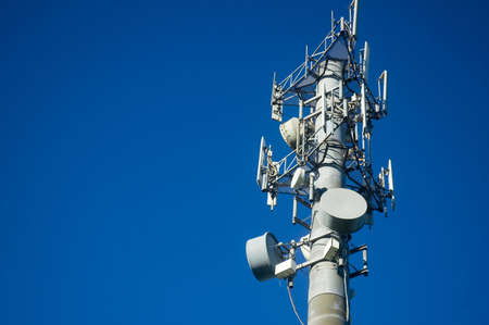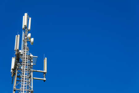 Close up of telecommunications cell phone tower with wireless communication antennas; blue sky background and copy space on the right