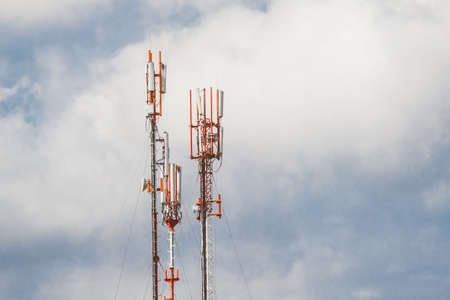 Telecommunication towers of mobile and cellular communication antennas on the background of the sky.