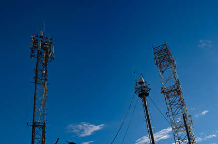 telecommunication towers with antennas in blue sky