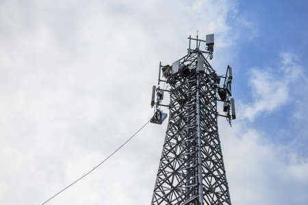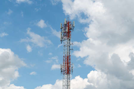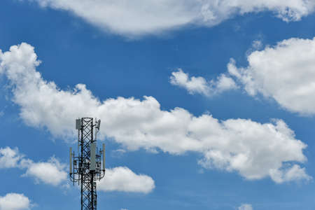 Mobile phone communication antenna tower with the blue sky and clouds