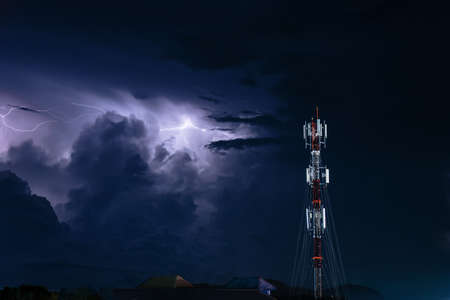 Thunderstorm with lightning over the cell phone antenna tower at night