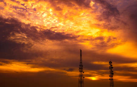 Two telecommunication towers on dramatic dark-orange sky and cumulus clouds background