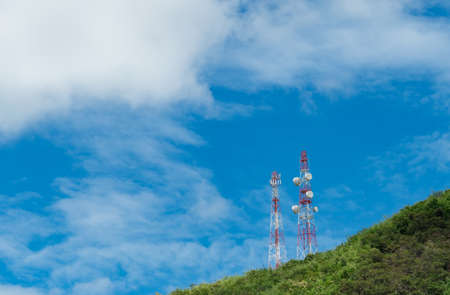 Telecommunication tower on mountain and green tree with blue sky. Antenna on blue sky. Radio and satellite pole. Communication technology. Telecommunication industry. Mobile or telecom 4g network.