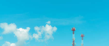 Telecommunication tower with blue sky and white clouds background. Antenna on blue sky. Radio and satellite pole. Communication technology. Telecommunication industry. Mobile or telecom 4g network.