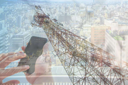 Mobile phone and internet cell tower over against sky. 5G wireless radiation antennas.