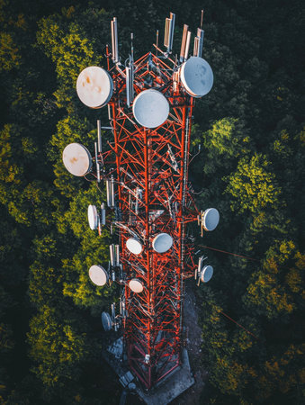 Aerial view of mobile phone cell tower to illustrate lack of broadband internet service in rural areas and need for investment