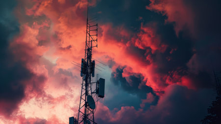 Telecommunications tower cells for mobile communications against sky background