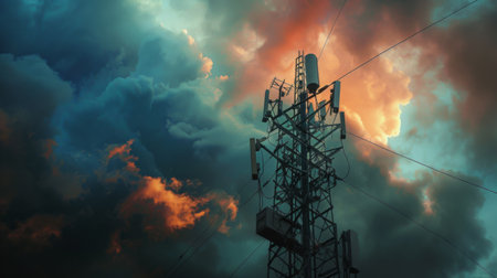 A close-up of antennas and cables on a signal tower against a dramatic cloudy sky