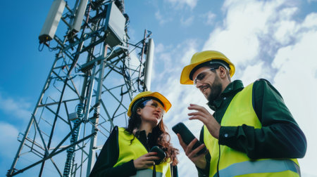 A team of engineers at the base of a cellphone tower, discussing plans and performing technical assessments