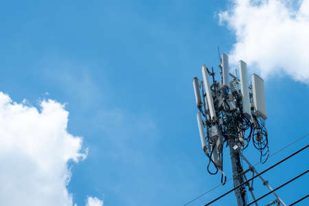 Cellular Base Station or Base Transceiver Station. Telecommunication tower. Wireless Communication Antenna Transmitter. 3G, 4G and 5G Cell Site with blue and cloudy sky.