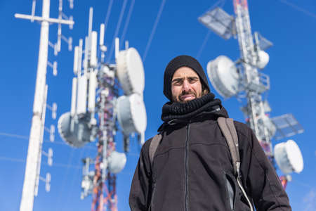 A tilting up shot of a young man standing in front of tall and complex telecommunication infrastructure, with transmitters attached to them.