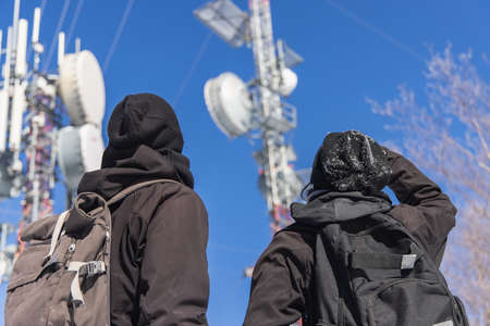 Shot of two tourists looking up at a tall infrastructure of telecommunication towers, with the attached antennas to convert signals.