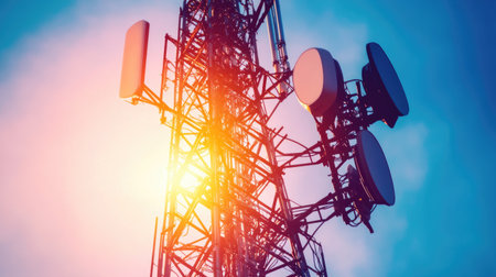 A striking image of a modern communication tower against a bright sky. Sunlight illuminates the structure, showcasing technology in telecommunications.