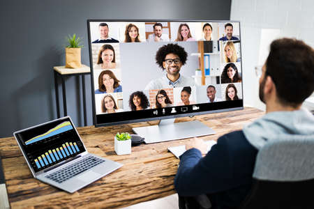 Virtual Business Meeting On Computer With Online Video Conference Webinar.