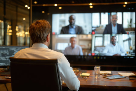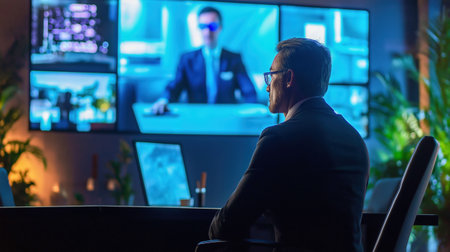 A professional man engages in a virtual meeting, surrounded by multiple screens displaying data. The ambiance is modern and tech driven, highlighting digital communicatio