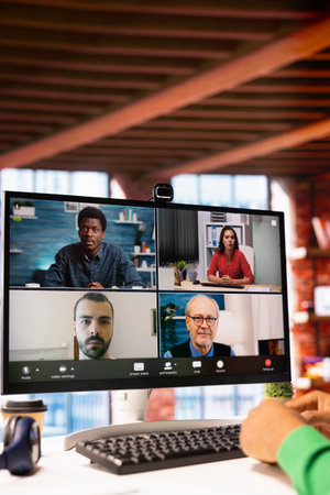 Remote worker looking at PC monitor discussing with coworkers during videocall from home. Close up of computer display used by teleworker in remote teleconference meeting with colleagues