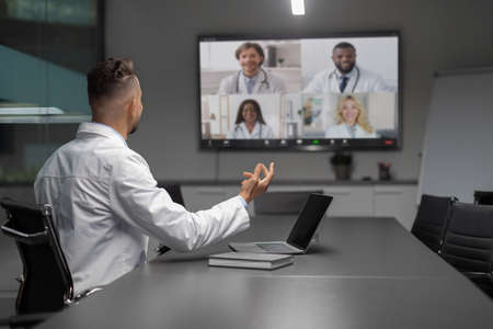 Back view of business man in video conference discussing strategy