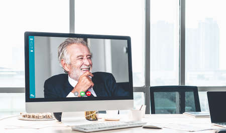 Video call business people meeting on virtual workplace or remote office. Telework conference call using smart video technology to communicate colleague in professional corporate business.